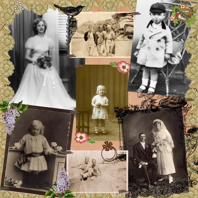Top left - My Nanna at 19 wearing a pale pink dress with fresh daphne in her hair and bouquet. She was a bridesmaid to her best friend.