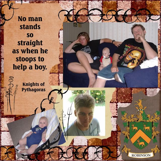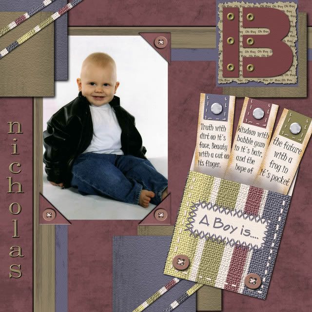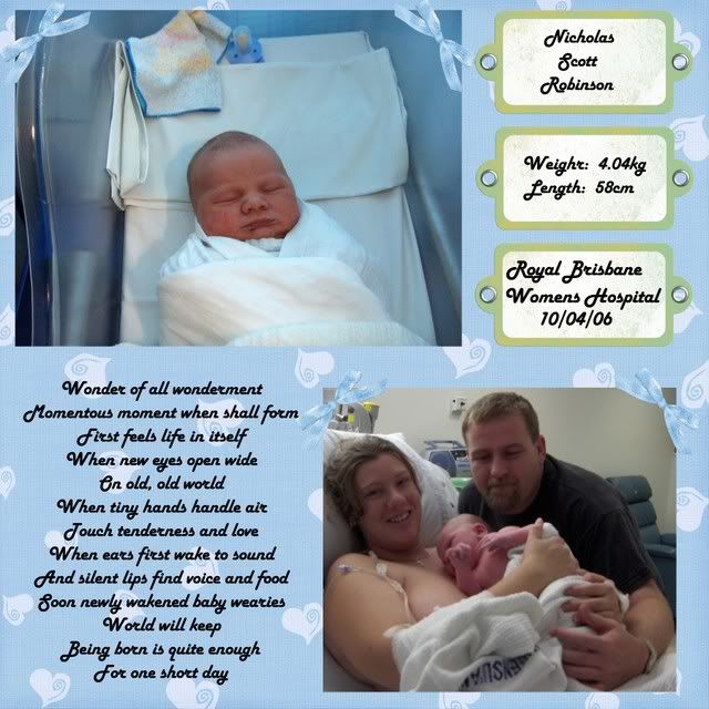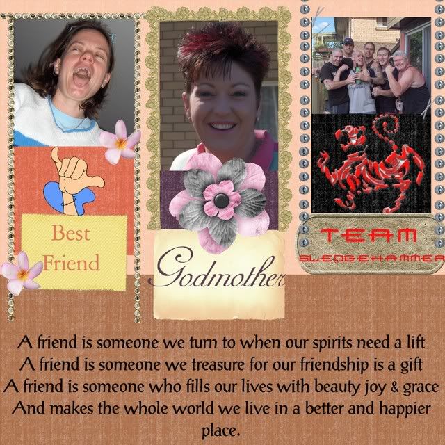 Well, after 3-4 days of scrapper's block I made this page for my forum competition themed "Friend or Family". This one is of friends. Team Sledgehammer are a group of mates (headed by Jimmy Shannon (Australasian Kickboxing Champ)) from Brisbane that we are really close to. Godmother is Simone, godmother to Nicholas through a funny turn of events.....and Best Friend is Danella, we have known each other for nearlly 10yrs and even after months of not chatting we get together and don't miss a beat. Here's to great friends in life!!